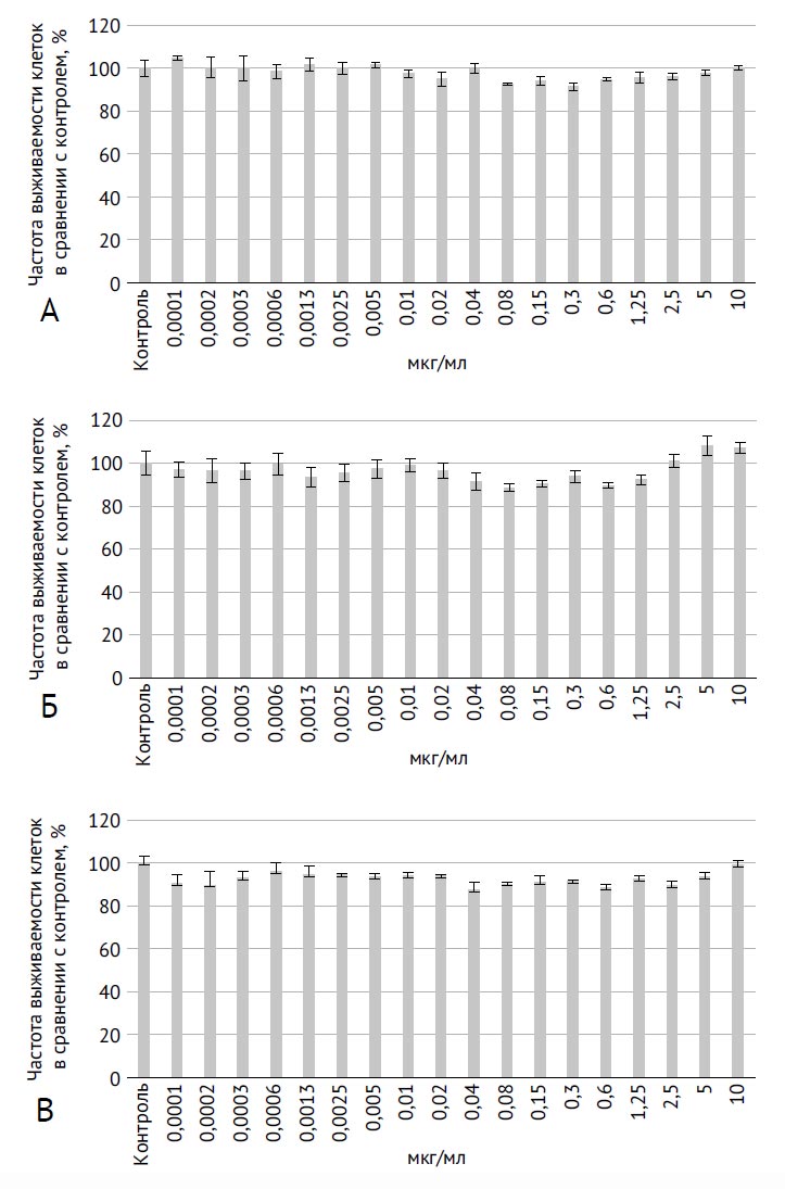 Рис. 2. Цитотоксическая активность исследуемых материалов в различных концентрациях (мкг/мл) в отношении клеток линии BEAS-2B; среднее значение ± стандартное отклонение выживаемости клеток в MTS-тесте после 48-часовой экспозиции исследуемых материалов: А — ОУНТ-1; Б — ОУНТ-2; В — хризотил-асбест; p >0,05 для всех сравнений с 0 мкг/мл в контроле