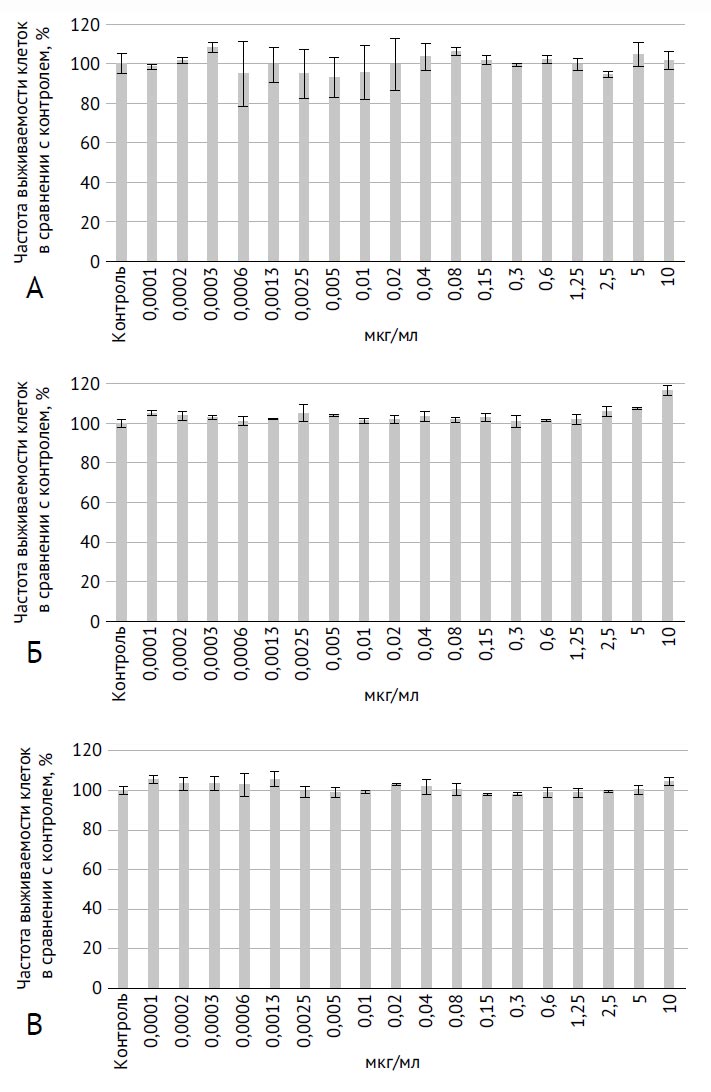 Рис. 1. Цитотоксическая активность исследуемых материалов в различных концентрациях (мкг/мл) в отношении клеток линии RAW 264.7; среднее значение ± стандартное отклонение выживаемости клеток в MTS-тесте после 48-часовой экспозиции исследуемых материалов: А — ОУНТ-1; Б — ОУНТ-2; В — хризотил-асбест; p >0,05 для всех сравнений с 0 мкг/мл в контроле