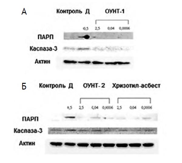 Заключение. Результаты исследования показали, что воздействие изучавшихся материалов не вызвало прямого цитотоксического действия в МТS-тесте и не оказало апоптического эффекта по результатам вестерн-блота в отношении макрофагов RAW264.7 и клеток бронхиального эпителия BEAS-2B. В проявивших большую чувствительность клетках бронхиального эпителия выявлено небольшое повышение экспрессии сигнального апоптического белка ПАРП, более выраженное для более коротких ОУНТ-2.