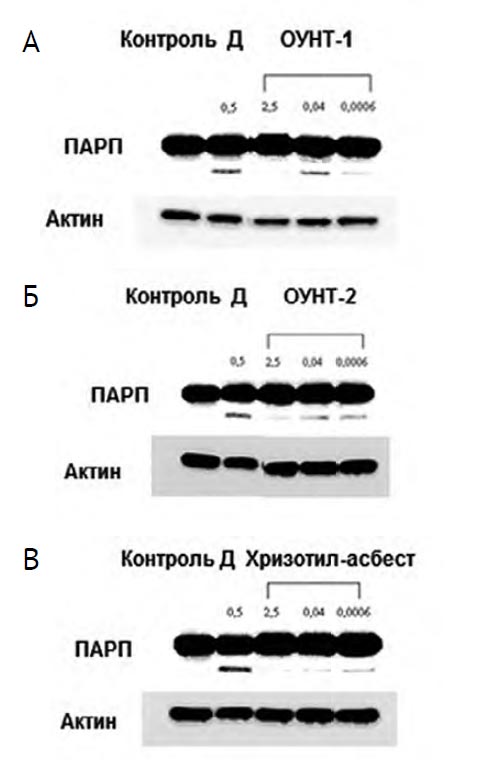Рис. 4. Картина репрезентативного вестерн-блота на клетках линии BEAS-2B (инкубация 48 ч): А — ОУНТ-1; Б — ОУНТ-2; В — хризотил-асбест; материалы использовали в концентрациях 0,0006, 0,04 и 2,5 мкг/мл; маркёр апоптоза — расщепленная форма поли-АДФ(рибоза)-полимеразы (ПАРП); актин — отражает уровень белка в образцах; доксорубицин (Д) — 0,5 мкг/мл