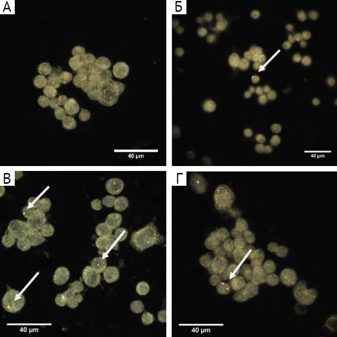 Изучение экспонированных культур BEAS-2B под действием концентрации 2,5 мкг/мл (наибольшая концентрация, на которой оценивали способность исследуемых материалов к индукции апоптоза) методом улучшенной темнопольной микроскопии выявило адсорбцию и накопление всех изученных материалов (ОУНТ-1, ОУНТ-2 и хризотил-асбеста) на поверхности и внутри клеток (указаны стрелками на рис. 5).
