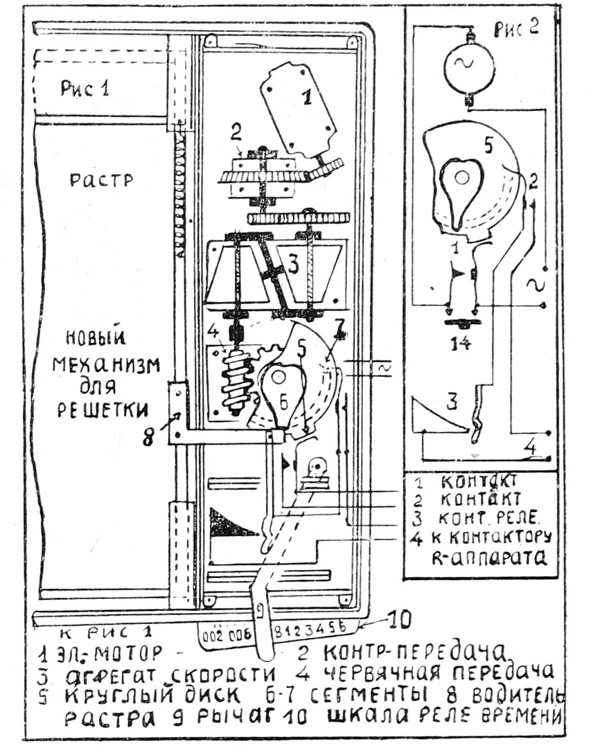 Из приведенной схемы видно, что работа мотора блокируется выступом круглого диска (деталь с комплектом №1) и пусковой кнопкой № 14. При нажиме на пусковую кнопку № 14 ток в 220 в подается в мотор и приводит в движение все агрегаты механизма, включая и растр.