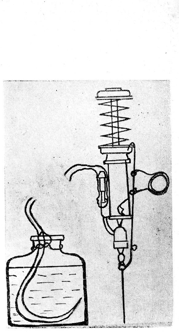 Естественно, чтобы привести в движение такую относительно большую массу, нельзя рассчитывать на силу разности давления, как это практикуется в современных шприцах непрерывного действия. Поэтому между дном канюльного механизма и про тивовоздушным клапаном мы поместили маленькую спиральную пружинку из неокисляющегося металла. С помощью этой пружинки противовоздушный клапан слегка конической формы, подобно пробке, герметично закрывает соответствующий конический просвет корпуса канюльного механизма на глубину 8—10 см и открывает этот просвет только в те моменты, когда сила гидравлического давления в верхнем отделе канюльного механизма превышает силу сопротивления пружинки, то есть когда оперирующий нажимает пальцем на пуговку стержня шприца.