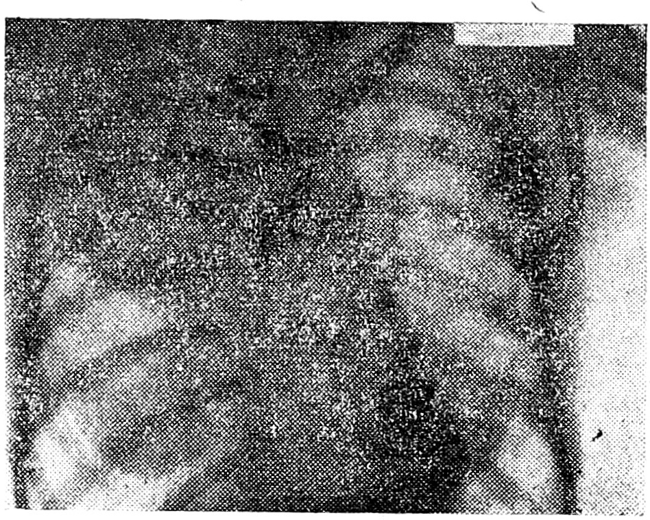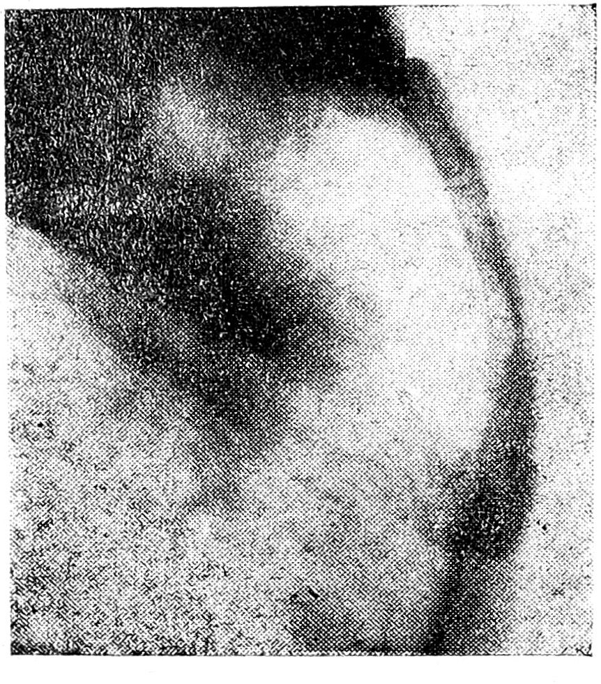 Примером может служить б-ная Ц., 48 лет, лечившаяся с 22/Х по 10/XI-57 г. по поводу крупозной пневмонии. При поступлении в верхней доле легких справа прослушивались сухие и влажные хрипы, крепитация. Рентгенологически на передней проекции определялось интенсивное затемнение, располагающееся соответственно верхней доле правого легкого (рис. 1).