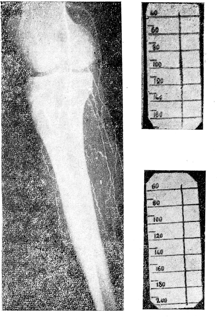 Почти у всех больных (за исключением трех) осциллограммы, снятые на уровне нижних третей бедра и верхних третей голени, показывали пульсацию. Величина осцилляторного индекса была различной (от 1 мм до 12 и 14 мм). Во всех случаях определялась более или менее типичная осциллограмма с началом и концом осцилляций, с показателем максимального и минимального давления. Только у трех больных указанной группы осциллограммы, снятые с бедер и голеней, с обеих сторон, дали «0» — нулевые осциллограммы, то есть прямые линии; осциллограммы, снятые с плеча, дали малые величины (1—2 мм). Артериограммы, снятые нацелено на участках, где не было осцилляций, показали полную проходимость просвета сосуда, но диаметр их был несколько меньший, чем у других больных этой же группы.