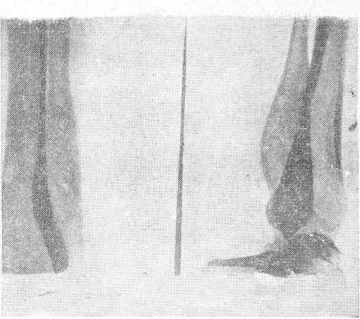 Реакция Касони отрицательная. 27/IV—операция под общим наркозом. Проксимальный отдел локтевой кости представляет кистозную веретенообразно раздутую опухоль; опухоль резецирована в пределах здоровой костной ткани. Дефект локтевой кости заполнен костным штифтом, взятым из правой больше-берцовой кости, 8 см длиною, 1½ см в поперечнике. Операционная рана на предплечье и голени зашита наглухо. Гипсовая повязка на всю руку. Локтевой сустав в положении сгибания под углом в 90°. На 17-й день после операции выписан в гипсовой повязке с нормальной температурой и в хорошем состоянии. Гистологический диагноз: фиброзный остит.
