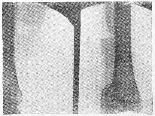 Рентгеновские снимки изменений не обнаружили. В 1936 году больной снова ушиб ногу и после этого вторично была произведена рентгенография уже в нашей больнице. На снимке была обнаружена киста в нижней трети бедра.