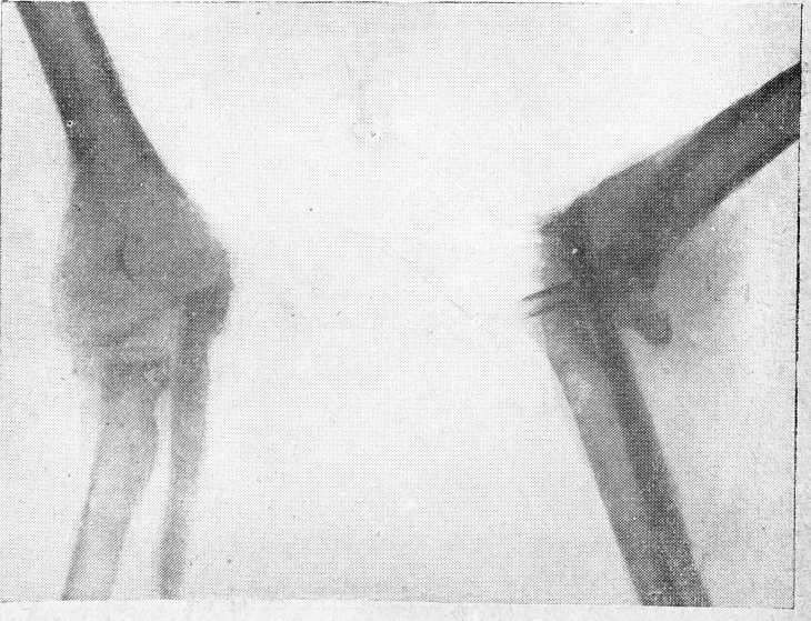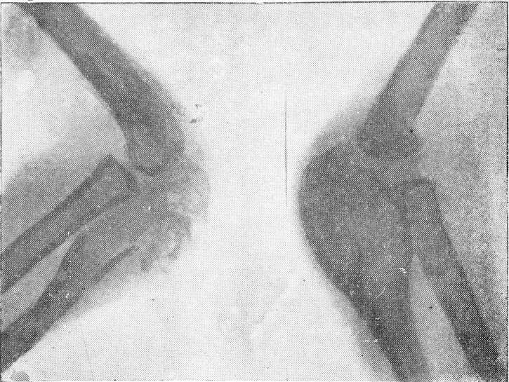 2-й случай. Н. К., 13 лет, поступил в клинику с жалобами на боли в правом локтевом суставе с ограничением движений в нем. В январе 1935 года был ушиб правого локтевого сустава; после ушиба в области сустава стала расти опухоль. 4/IV—повторный ушиб того же локтевого сустава. Имеющаяся опухоль на суставе после вторичного ушиба стала быстро расти; боли усилились, и движения в суставе стали ограничены.