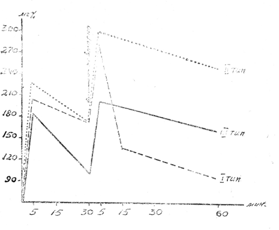 Натощак больному определялся сахар крови по методу Хагедорна — Йенсена, затем внутривенно вводилось 40 мл 40% раствора глюкозы и через 5, 15, 30 мин.. определялось количество сахара в крови. На 30-й мин повторялось введение глюкозы в той же дозе и вновь определялось количество сахара в крови через 5, 15, 30, 60 мин.