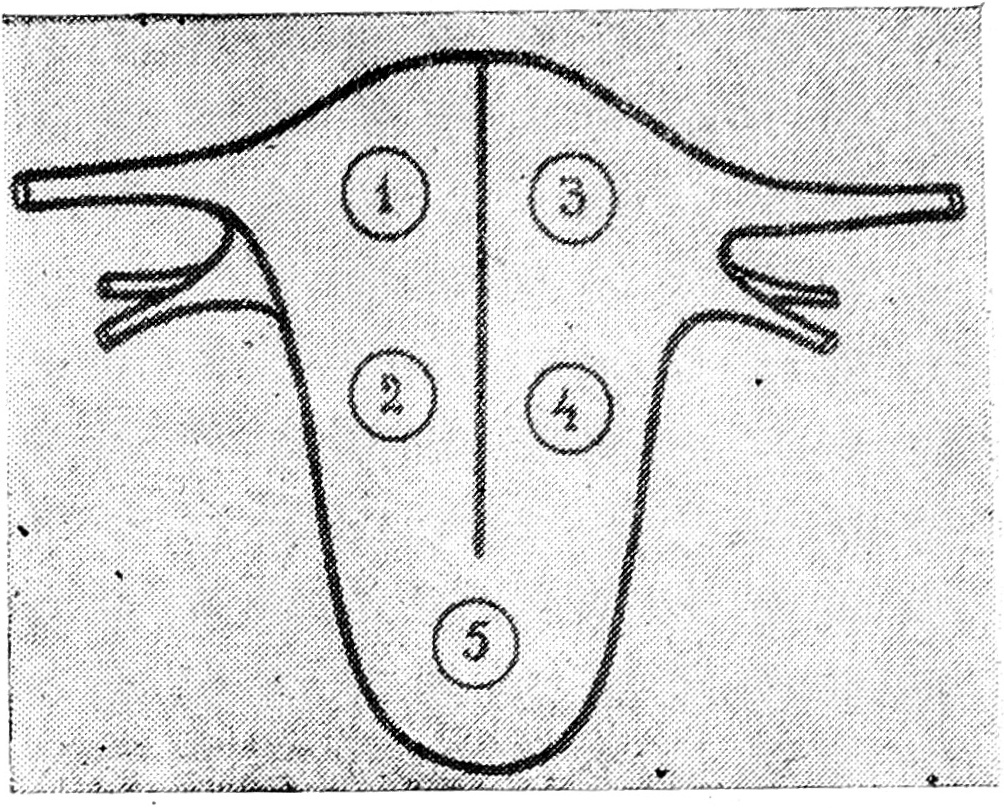 Порядок исследования: беременная укладывалась на кровать после обычного клинического исследования и опорожнения мочевого пузыря. На переднюю брюшную стенку накладывались пять датчиков, которые крепились эластическими поясами симметрично справа и слева соответствен но области дна, тела матки и по средней линии в области ее нижнего сегмента (рис. 1).