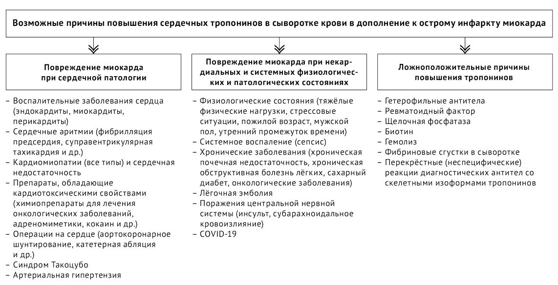 Рис. 1. Патологические и физиологические состояния, вызывающие повышение уровней сердечных тропонинов в дополнении к острому инфаркту миокарда, по [2] с изменениями и дополнениями