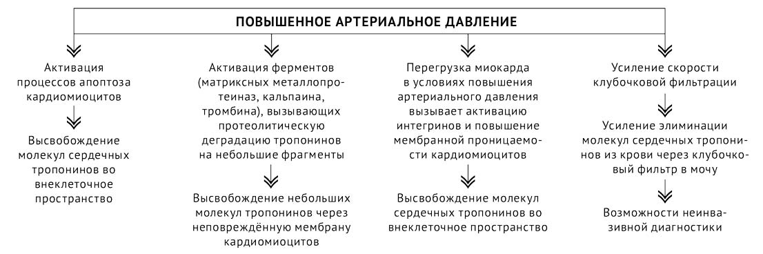 Описанные выше механизмы повышения уровней cTnT и cTnI в биологических жидкостях человека при АГ суммированы на рис. 2.