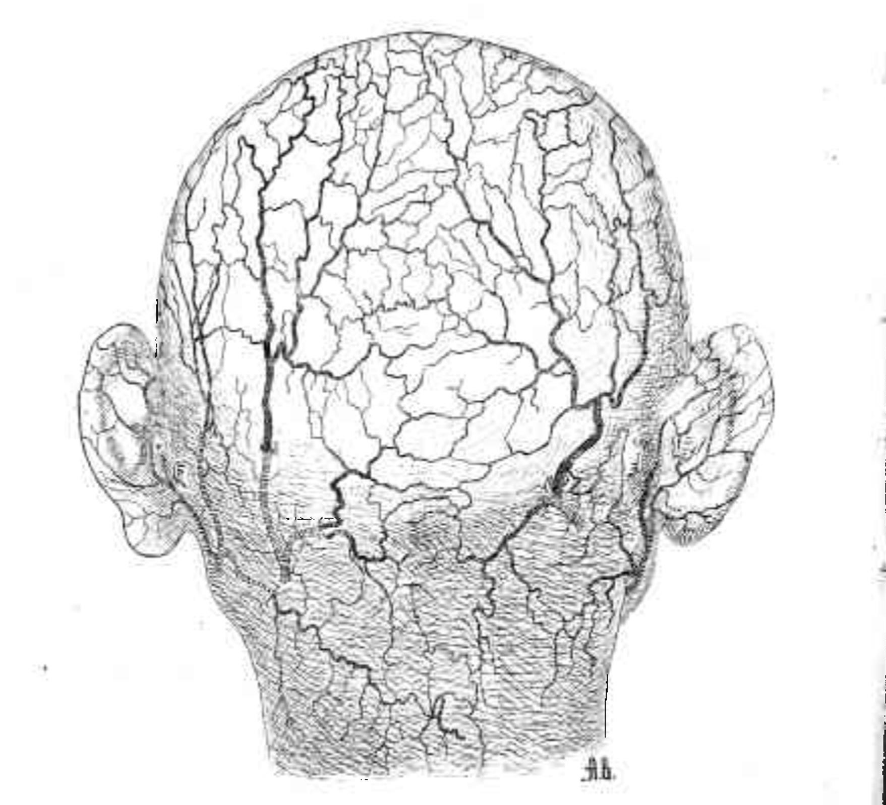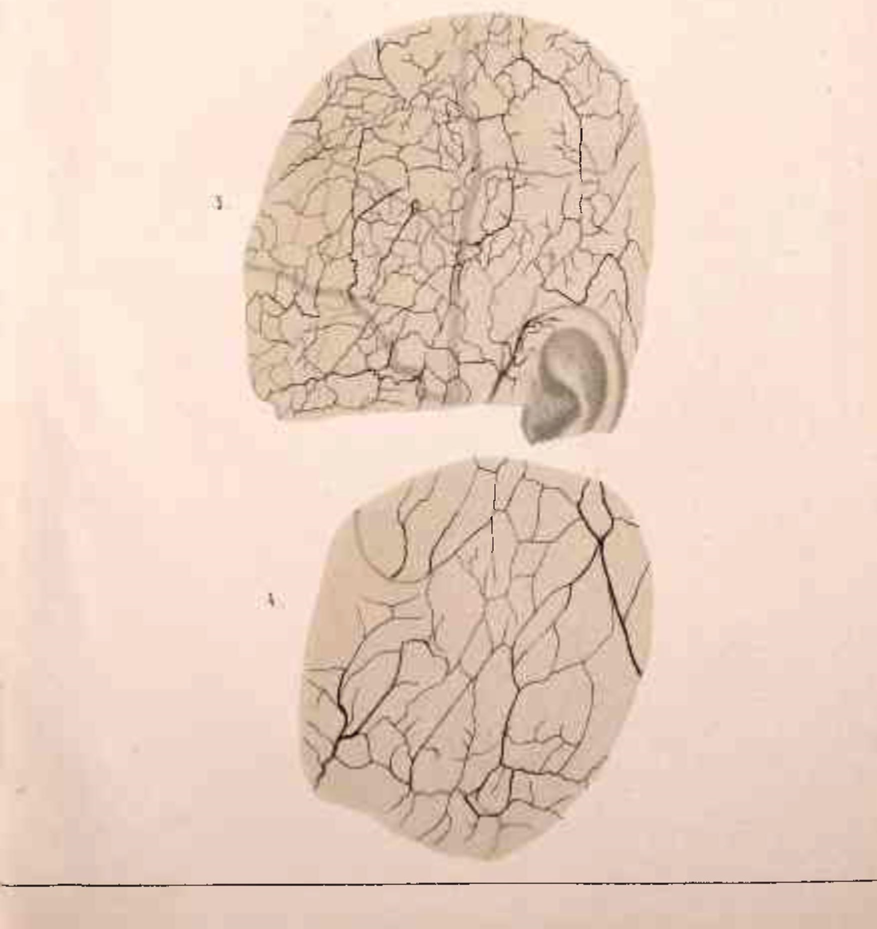 У Loder’a,30 перваго мнѣ удалось найти изображеніе небольшого участка кожи головы 3-хъ лѣтняго ребенка съ чудно налитыми артеріальными сосудами. „Когда кожа снималась съ головы, большія вѣтви были отрѣзаны отъ ихъ стволовъ; меньшія же соединяются при посредствѣ безчисленныхъ анастомозовъ и проходятъ змѣеобразно извитыми“. На рисункѣ находимъ неимовѣрно густую мелкопетлистую сѣть, но всѣ артеріи изображены въ одной плоскости, что сильно умаляетъ достоинство рисунка.