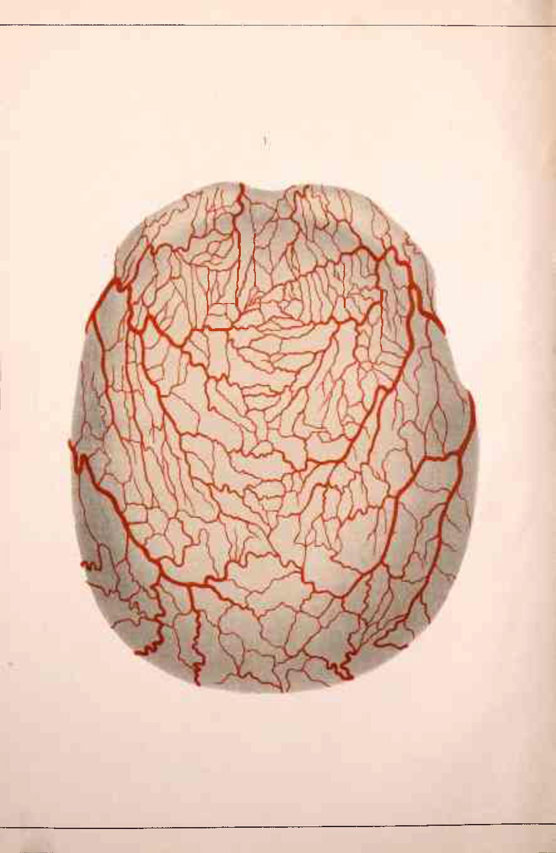 Инъекція киноварью безь мѣла. Обработка скипидаромъ. Сосуды крышки черепа, богато анастомозируя, образуютъ па galea aponeurotica цѣлую сѣть. Анастомозы различной величины, особенно велики въ области темянныхъ бугровъ и медіально отъ нихъ. Ячейки различной величины и различной формы; въ области затылка онѣ размѣромъ гораздо больше, чѣмъ въ темянной области. Ячейки надапоневротической сѣти надъ срединной линіей и близь нея располагаются своимъ наибольшимъ діаметромъ перпендикулярно срединной линіи. На вискахъ имѣется довольно большое количество ячеекъ, вытянутыхъ въ сагитальномъ направленіи. Тонкими сосудами, идущими отъ этой сѣти, образуется въ нижнихъ слояхъ дермы rete cutaneum; ячейки ея малы, анастомозы топки.
