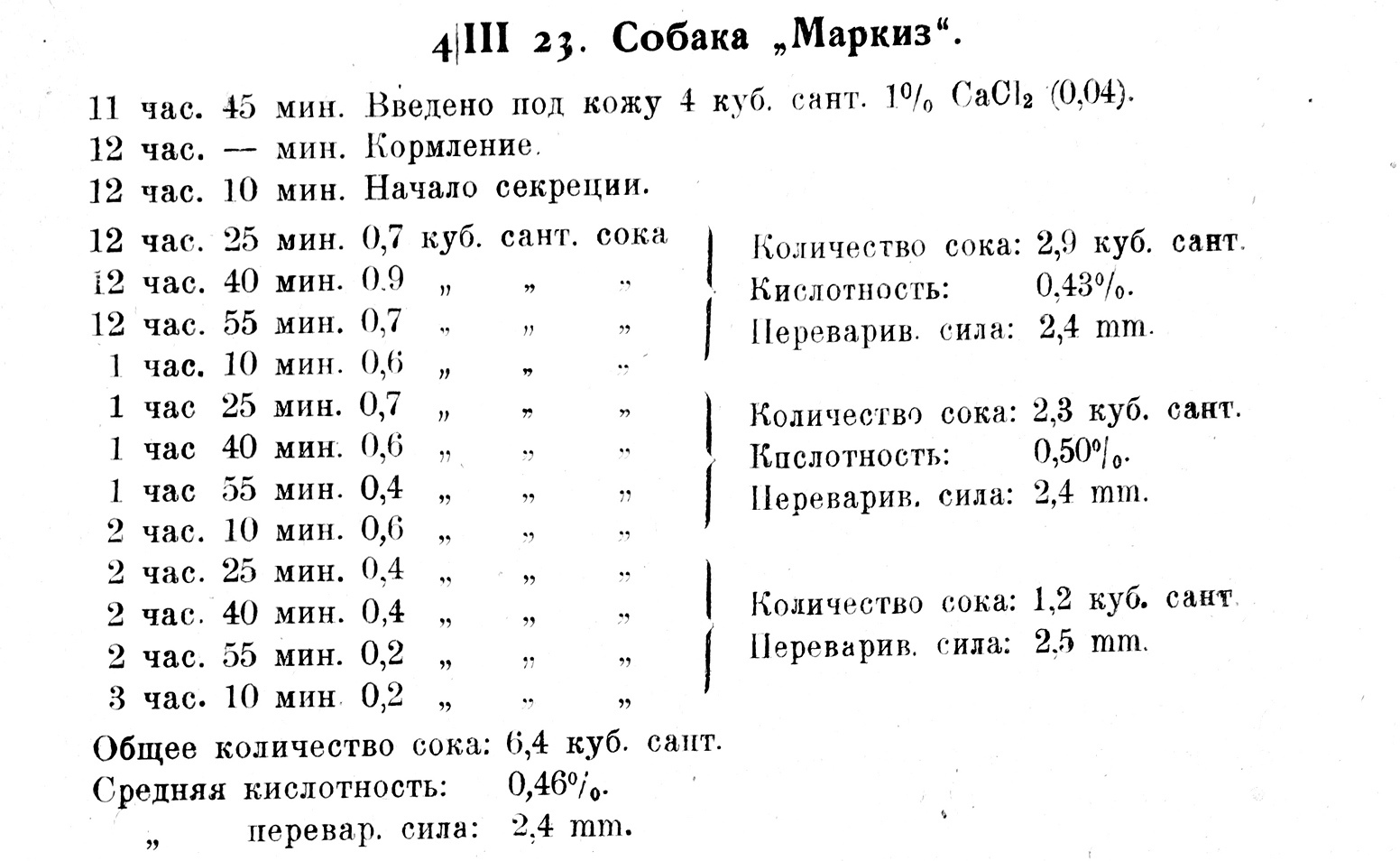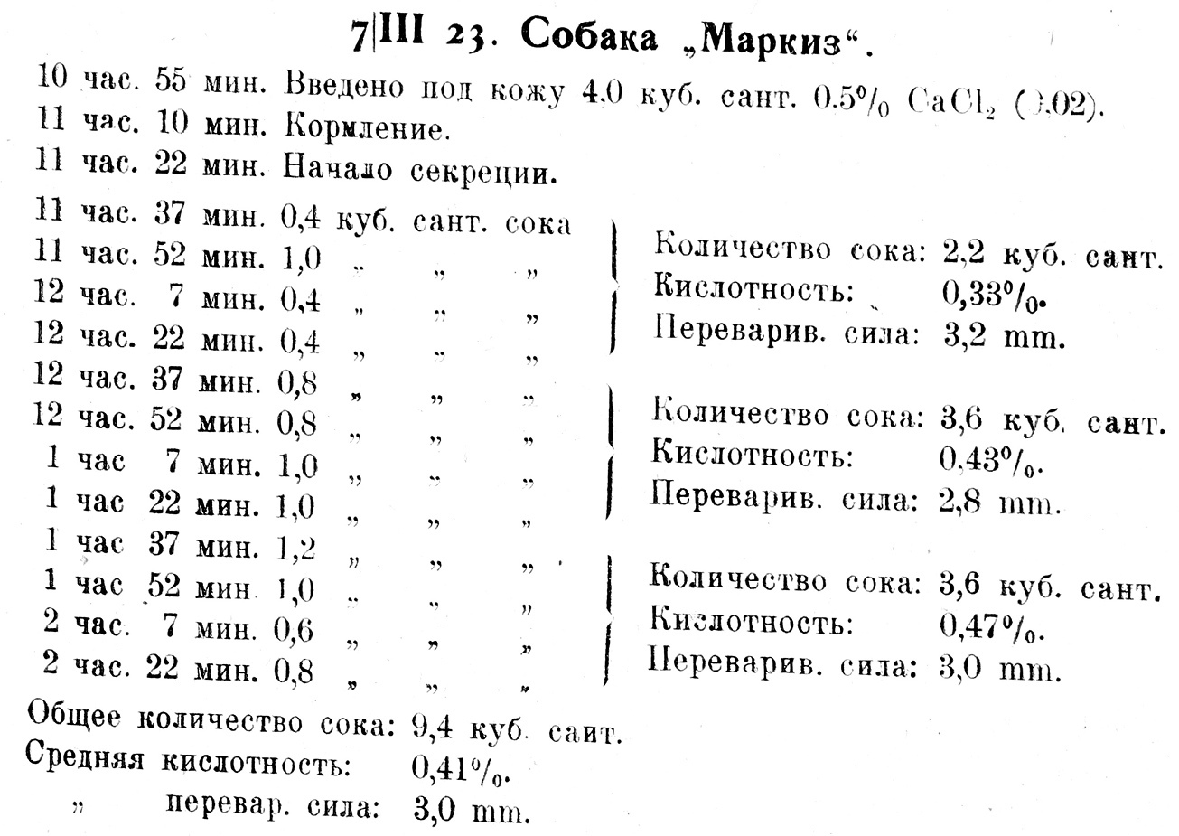 О влиянии хлористого кальция на работу желудочных желез нам не удалось найти в литературе прямых указаний; нам только известно, что СаС12 небезучастно относится к секреции вообще; так, напр., из опытов Mac Callum’a14) работавшего с изолированной кишкой кролика, выявляется антагонистическое действие СаС12 к NaCl: в то время, как последний при нанесении на брюшинную поверхность кишки вызывал накопление в полости ее значительного количества жидкости, СаО12 быстро устранял дальнейшее накапливание. Желая выяснить, не является-ли эта соль антагонистом NaCl, при той же постановке опытов, и в отношении к желудочным железам, мы предприняли исследования с введением разных доз этой соли, растворенной в небольших об’емах воды, а также поставили ряд опытов с введением СаС12 в сочетании с 0,95% раствором NaCl. При этих исследованиях мы брали дозы: 0,02 в 1%, 0,02 в 0,5% и 0,04 в 1% растворах. Приводим ниже в сжатом виде протоколы некоторых опытов, рисующих, по нашему мнению, характерное действие СаС12.