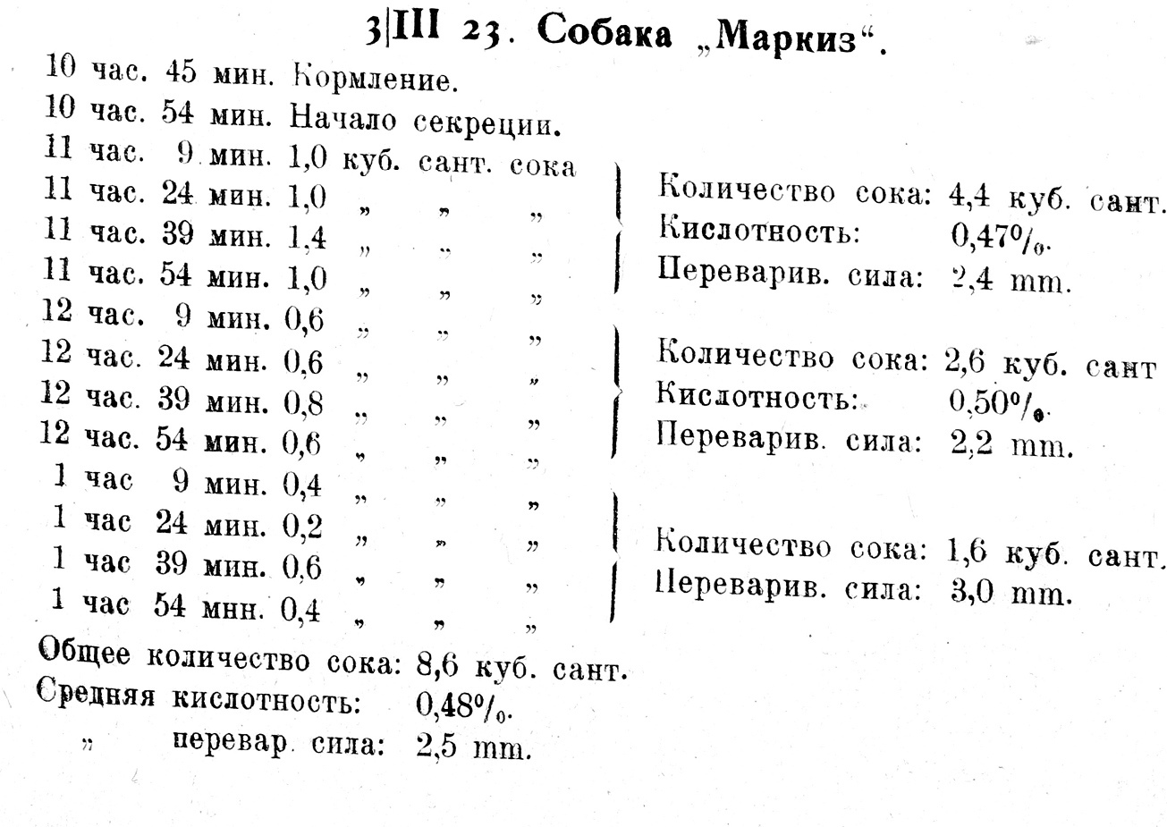 Итак при подкожном введении растворов NaCl мы обнаруживаем заметное действие этой соли на секреторный процесс желудочных желез. Из всего вышеприведенного нельзя не видеть, что NaCl действительно обладает сокогонным действием по отношению в желудочным железам. В заключение упомянем, что нами было поставлено несколько опытов с введением малых доз (0,01 в 0,5% растворе) NaSO4, где также мы отметили усиление секреции, но не в столь сильной степени, как при изотоническом растворе NaCl.