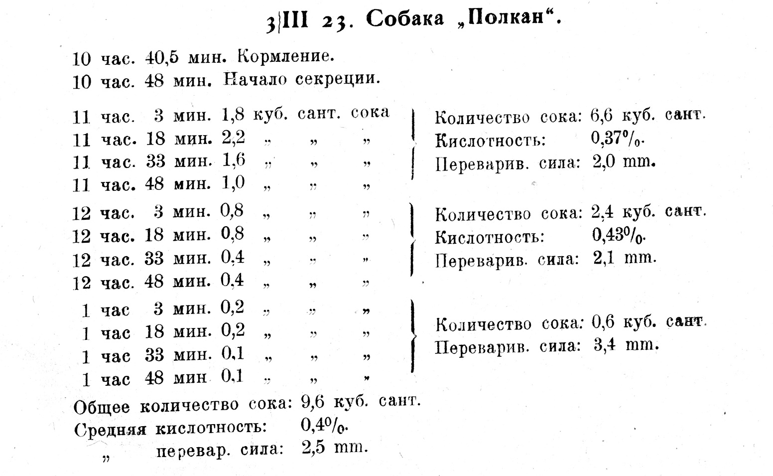 Итак мы видим, что при решении вопроса о секреторном действии NaCl все исследователи при своих опытах вводили растворы этой соли в полость желудка, что, разумеется, не могло не служить источником неправильных заключений, так как при таком способе мы имеем перед собою главным образом рефлекторный эффект действия NaCl, но не непосредственное его действие на железистые клетки. Последнее можно до некоторой степени выяснить лишь при условии циркуляции испытуемого вещества в крови. Задачей настоящей работы и являлось, между прочим, решение вопроса о действии NaCl на железистый аппарат желудка путем подкожного введения животному небольших количеств гипо-, изо- и гипертонических растворов его. Опыты производились на 2 собаках с изолированными по Heidenhаin-Павлову желудочками. Порядок постановки опытов был таков: голодавшему не менее 15 часов животному вводилось под кожу 50 куб. с. раствора NaCl, а через 15 минут после этого давался корм. Желудочный сок собирался каждые 15 минут. В часовых порциях сока исследовались кислотность (титрованием n/10 раствором NaOH, индикатор фенолфталеин) и переваривающая способность (по Метту[13]). Приводим несколько примерных опытов с введением различных растворов соли.