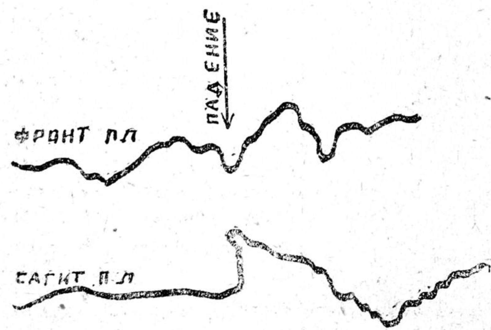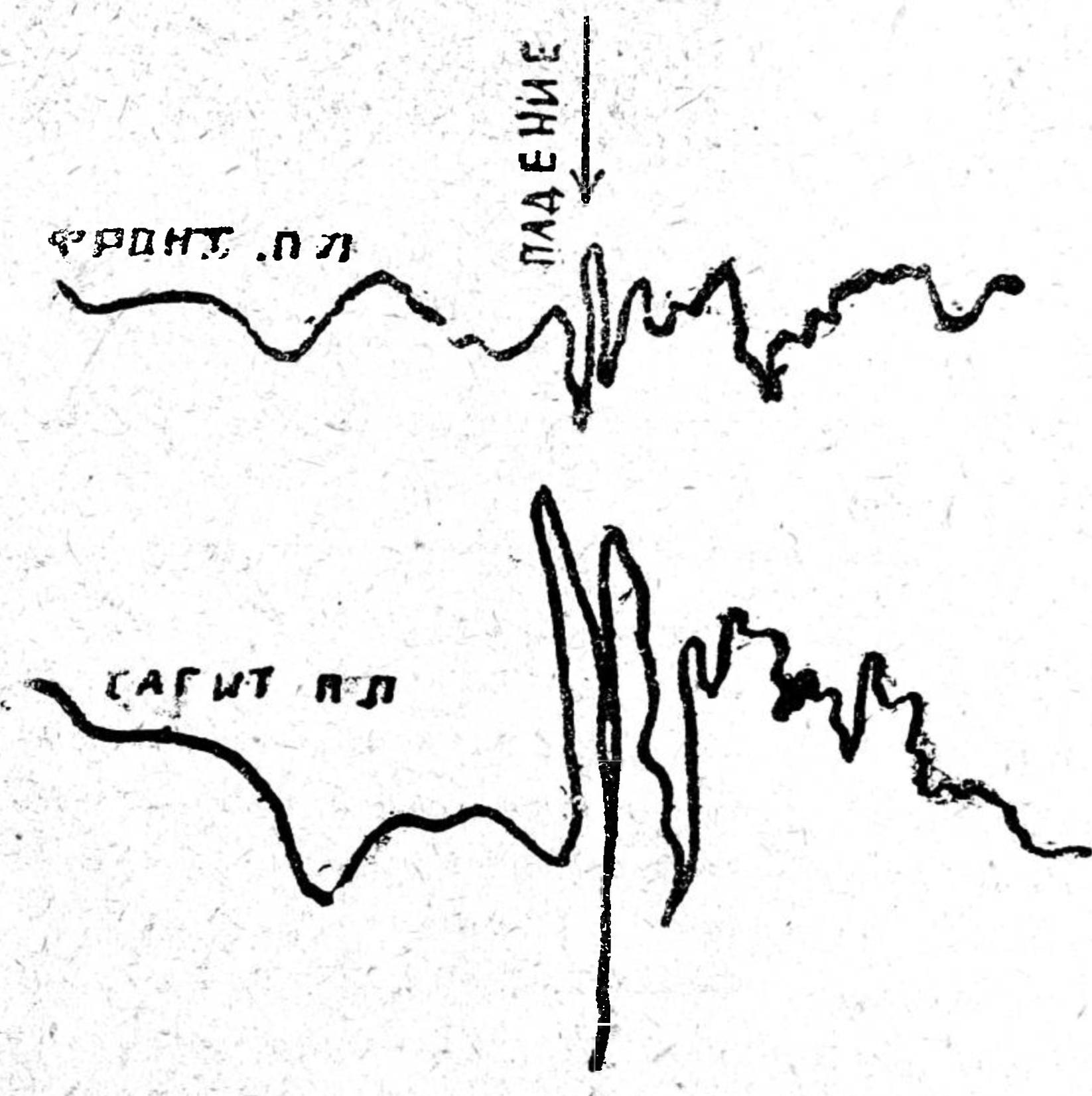 Наконец, в известном проценте случаев (по нашим наблюдениями—все-таки сравнительно редко), получается парадоксальная реакция: после падения колебания на время прекращаются. Мы объясняем это тем, что некоторые лица реагируют на испуг, связанный с неожиданным падением точки опоры, тоническим напряжением всей мускулатуры тела, как бы оцепенением. Пример такого типа кривых изображен на рис. 6.
