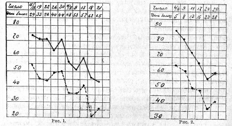 Рисунки №№ 1 и 2 представляют кривые С1Н и общей кислотности у больных с задержкой желчи при исследовании желудка по Воas-Ewаld’y. Кривые падают соответственно падению желтухи. (См. диссертацию С. С. 3имницкого „Отделительная работа желудочных желез при задержке желчи в организме“, СЦБ., 1901).