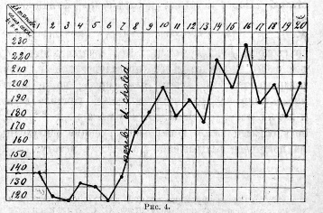 Таким образом можно путем последовательного изучения иногда подметить тот биологически интересный и клинически важный факт, что клетка, выведенная болезнью из своего нормального состояния, при возвращении к норме проходит ряд промежуточных состояний в своих функциях. Иногда болезнь обусловливает замирание функциональной жизни клетки; так, напр., при сердечных отеках, при Oedemkrankheit реакция на 1-ое и 2-е раздражение нередко протекает так: