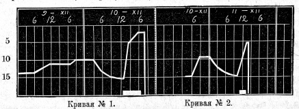 III.П.Л. (К. И., № 418, 1923 г.), 23 лет, беременна в III раз. Имела 2 срочных родов; после родов болела 2 месяца. Размеры таза нормальны. Последние регулы в начале марта 1923 г. Роды начались в 5 час. вечера 10/ХІІ. Предлежание затылочное, позиция вторая. Схватки (см. кривую № 1) средней силы, к 9 часам вечера стали чередоваться с промежутками в 8 мин., но к 1 часу ночи стали слабеть и становиться все реже. В 11 час. дня 11/XII введен проктейринтер. В 12 час. схватки сильнее и чаще. В 1 час дня схватки сильные и частые. Баллон извлечен в виду жалоб роженицы на сильное давление и позывы на низ. Ребенок женского пола, весом 3400 грм.. родился в 2 часа дня. Первый период родов длился 20 час. 20 мин., причем 18 час. 15 мин продолжался период слабости потуг. Второй период длился 1 час 10 мин., третий—30 мин., а весь родовой акт--22 часа. Проктейринтер лежал 2 часа. Послеродовой период протекал гладко.