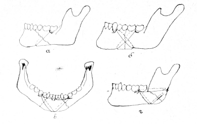 Фиксация отломков нижней челюсти: а — при косом переломе с углом более 30°; б — при поперечном переломе с углом 80—90°; в — при двустороннем переломе подбородочного отдела (отрыв подбородка); г — при переломах угла нижней челюсти.