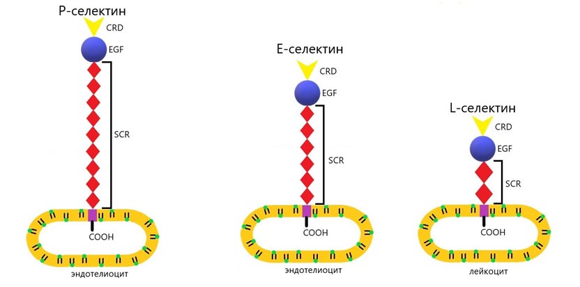 Селектин | L (MEL-14, CD62L) | Е (ELAM-1, CD62E) | Р (GMP-140, PADGEM, CD62P) |