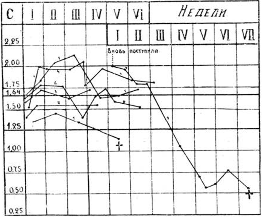 Такую же тенденцию к падению карбонатного числа, в связи с ухудшением общего состояния мы видим и во вторим случае данной группы, также закончившемся смертью—№ 1, где epicrisis по отношению клочкам был: nephroso-nephritis ehr., praecipue nephrosis. Что касается других больных этой группы то можно видеть, что с улучшением общего состояния перед выпиской больных величина С устанавливается на верхней границе нормы.