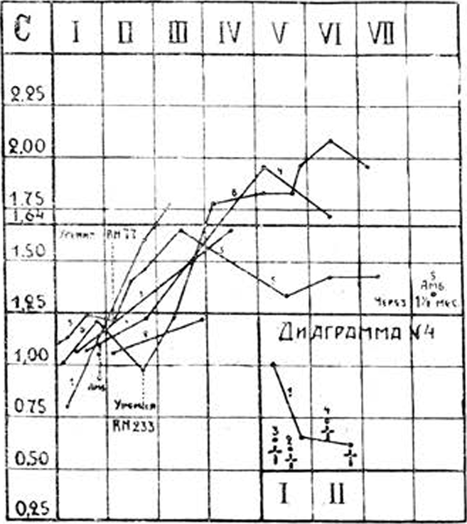 Перейдем к рассмотрению диаграммы № 3. Здесь мы видим резко бросающуюся разницу в ходе кривых карбонатного числа всех больных данной группы в сравнении с первыми двумя диаграммами. Характерен здесь довольно крутой под’ем кривых с низких цифр: в первые две педели наблюдения у всех больных данной группы карбонатное число значительно ниже нижней границы нормы, с улучшением же общего состояния больных число эго круто поднимается, заходя у некоторых за верхнюю границу нормы. Клинически данная группа обнимает случаи острого диффузного заболевания почек с поражением сосудов и канальцев (nephritis acuta).