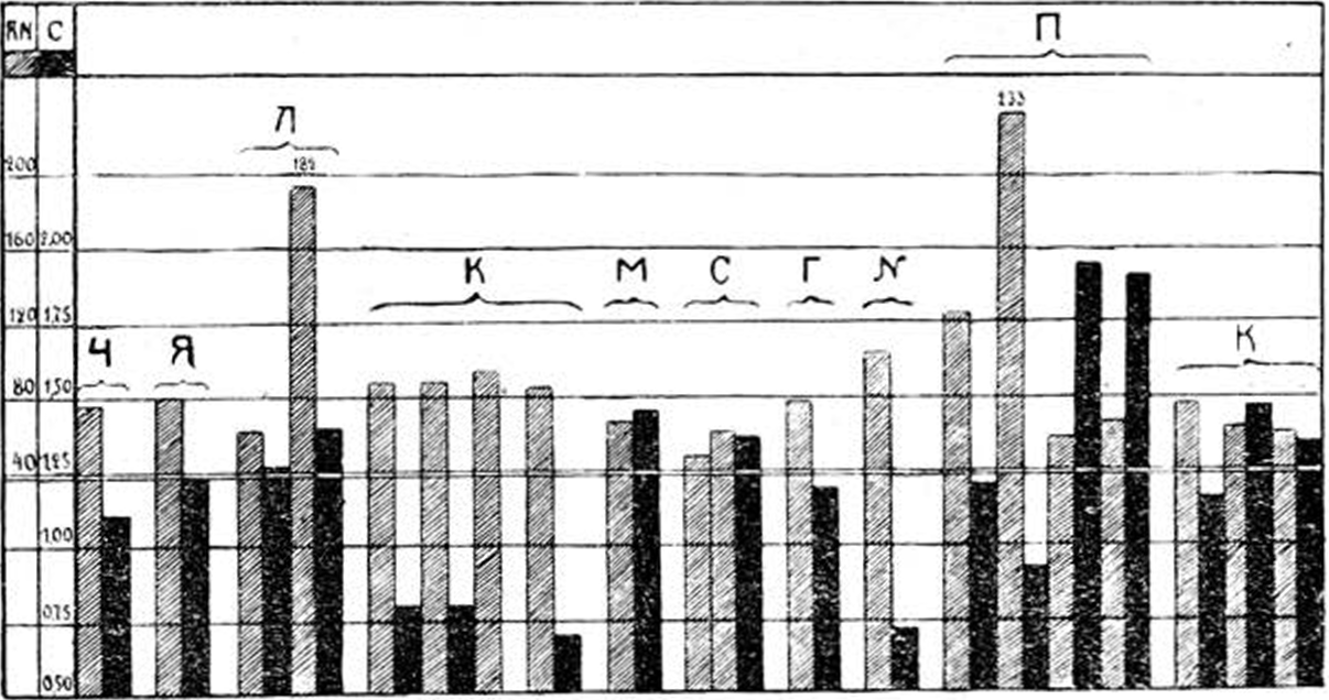 Остановимся еще вкратце на вопросе о соотношения между RN крови и щелочным запасом, каковое соотношение представлено на диаграмме № 5. Общий фон диаграммы таков, что здесь имеется известное соотношение между указанными величинами, а именно, мы можем видеть, что с повышением RN крови карбонатное число всегда понижается ниже нижней границы нормы, хотя строгой пропорциональности между этими изменениями и нет. Так, иногда при значительном понижении щелочного запаса наблюдается сравнительно незначительная задержка мочевины крови (случаи Ч и К), и наоборот, при значительной задержке RN крови величина щелочного запаса остается нормальною или почти нормальною (случаи Л и П диаграммы). Это отступление от вышеуказанного соотношения мы считаем необходимым подчеркнуть, ибо дальнейшее наблюдение клинической картины в этих случаях,—правда, очень немногочисленных,—показало нам прогностическую ценность определения щелочного запаса у азотэмиков: оказалось, что у нефритиков с небольшой сравнительно азотэмией, но ясно выраженным, стойким ацидозом, дело быстро идет к летальному исходу; там же, где большая задержка RN крови сопровождалась близкими к норме щелочным запасом, равновесие организма быстро выравнивалось, и больные становились работоспособными. На эту стойкость нефритиков с большим RN крови, доходящим до 4,5— 3,5 и держащимся втечение нескольких лет, с одновременным почти нормальным щелочным запасом, указывает и Delore.
