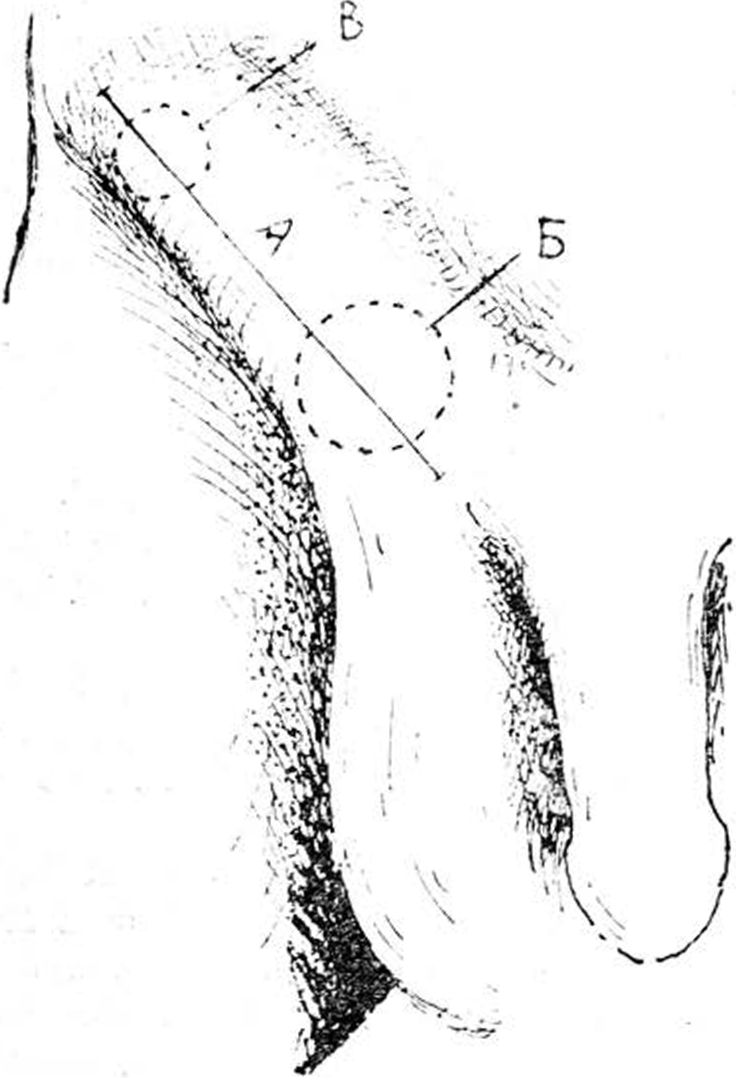Рис. 1. А—разрез кожи. Б—наружное отверстие пахового канала. В—внутрен. отверст. пахов. канала.