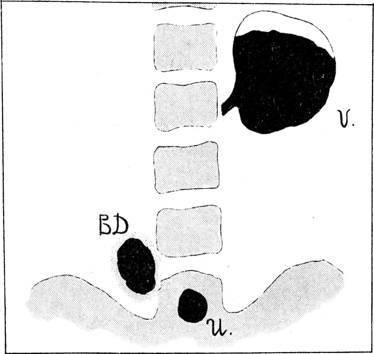 Этот неожиданный результат рентгеноскопии желудка заставил меня внимательнее отнестись к больному, и в течение следующей недели последний неоднократно подвергался рентгеновскому исследованию. причем оказалось, что желудок у него состоит из очень небольшой полости, соответствующей разве фундальной части его и находящейся на расстоянии И—12 сайт, от пупка. Из этой маленькой полости в остальные, т. е нижележащие, части желудка ведет, невидимому, узкий канал, только начало которого видно на экране. Перистальтических волн не наблюдается.
