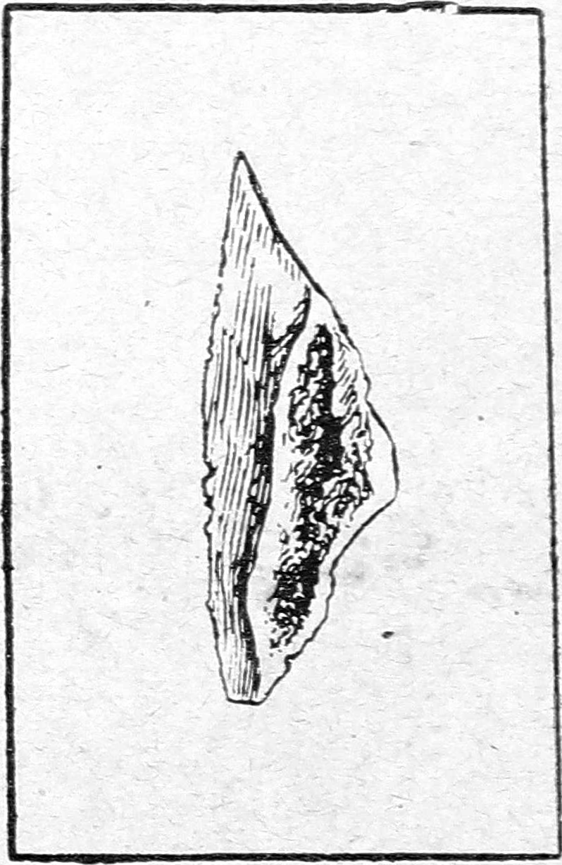 После зондирования больная почувствовала ухудшение, боли усилились. В клинику больная обратилась, чувствуя себя очень скверно: она испытывает сильную боль при глотании, не может ничего есть; 37,8°, а накануне вечером 38,4°. Шея спереди в области гортани очень болезненна при пальпации. Под местной анэстезией в сидячем положении произведена эзофагоскопия (проф. В. К. Трутнев). На глубине 20 сант. от края зубов обнаружена кость, которая располагалась поперек просвета пищевода так, что острые концы ее врезывались в боковые стенки последнего. В виду этого экстракция удалась не так легко, кость срывалась со щипцов. Наконец, после некоторых усилий, удалось левый конец кости оттянуть в более подходящее для экстракции положение, после чего и вся кость легко потянулась за щипцами. Кость эта была в 31/2 сант. длиной, 0,7 сант. шириной и 3 мм. толщиной (см. рис.). В последующие дни больная показывалась в клинику; боли у ней постепенно стихли, глотание пищи наладилось, из-под наблюдения больная вышла вполне выздоровевшей. В рассматриваемом случае инородное тело значительной величины, с острыми краями, было, повидимому, заклинено зондом врача, подававшего больной первую помощь. Сильная болезненность шеи и лихорадка указывали на начало периэзрфагита. Своевременным удалением тела удалось, однако, предотвратить развитие дальнейших опасных осложнений.