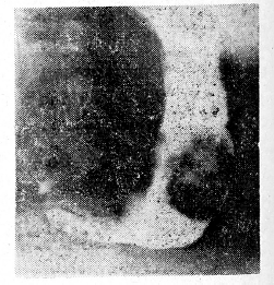 В ходе поисков причин анемии (НЬ — 0,62 ммоль/л, эр. 2,8 • 1012 в 1 л, тромбоц. 250 • 109 в 1 л, цв. показатель— 0,7; СОЭ — 43—54 мм/ч) у больной при рентгенологическом обследовании желудка обнаружен округлой формы дефект наполнения до 5 см в диаметре с довольно четкими контурами (см. рис.). Общая кислотность желудочного сока составляла 60 ммоль/л, свободная НС1 — от 0 до 40 ммоль/л. Реакция Грегерсена резко положительна.