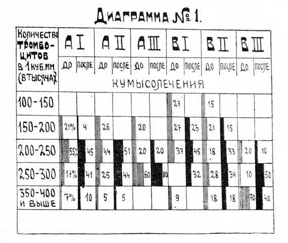 Обращаемся к изменениям тромбоцитов, происшедшим в результате кумысолечения. Правые половины двойных столбцов характеризуют эти изменения. Из диаграммы видно, что после лечения тромбоциты в случаях с пониженным содержанием их наросли, приближаясь к нормальным цифрам. Из группы ВІ и ВII. где до лечения число их в 100— 150 тыс. в I куб. мм. составляло 15—27%, в результате кумысолечения с таким содержанием не осталось ни одного случая. Максимальное увеличение тромбоцитов в некоторых случаях достигало 120 тыс. Кроме этого нарастание их отмечено (правда в меньших пределах) и там, где исходные цифры были нормальными. Высокие цифры тромбоцитов, главным образом в группе ВIII, имели явную тенденцию к падению. Уменьшение в случаях их высокого содержания равнялось 100 тыс. (шах.). Из 4-х случаев группы СIII двое вовсе кумысом не пользовались, двое других изредка по своей инциативе пили 1—2 б. кумыса; у этой группы существенных колебаний в числе тромбоцитов по сравнению с исходными цифрами (см. выше) отмечено не было. Таким образом количественные изменения тромбоцитов под влиянием кумысолечения несомненны. Что же касается изменения морфологической картины их, то в этом отношении определенных выводов сделать нельзя. Можем только отметить, что в некоторых случаях патологические формы гигантские, базофильные, нитевидные и т. п. после кумысолечения встречались в меньшем числе, нежели до лечения.