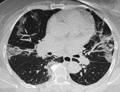 Рис. 1. Рентгеновская компьютерная томограмма при госпитализации (КТ 2)