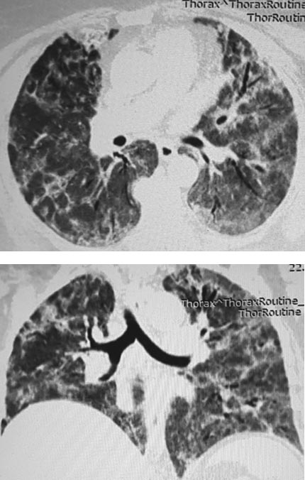 В течение следующей недели пациентка смогла полностью отказаться от дополнительной кислородной поддержки, свободно передвигалась в пределах палаты. Данные РКТ демонстрировали хорошую динамику в виде повышения прозрачности лёгочной ткани (рис. 3).