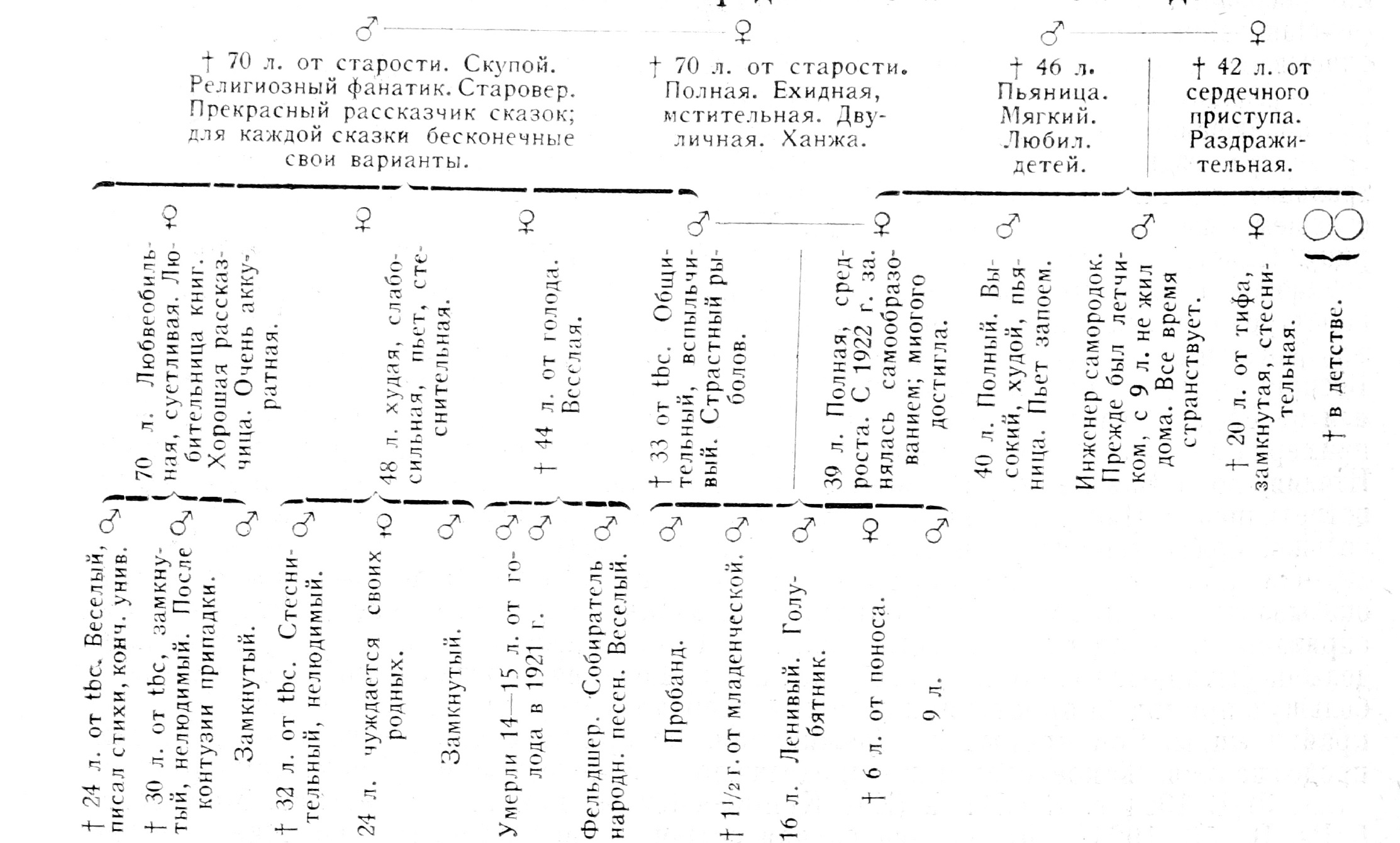 Мы видим, что со стороны отца в семье был целый ряд прекрасных рассказчиков, дед по отцу („начнет рассказывать одну и ту же сказку и не узнаешь второй раз все по новому и по своему перескажет“), тетка по отцу, двоюродный брат писал стихи, другой двоюродный брат собиратель народных песен В семье матери имеется также дядя—инженер-самородок, летчик, все время странствующий. Сам пациент—писатель, поэт.