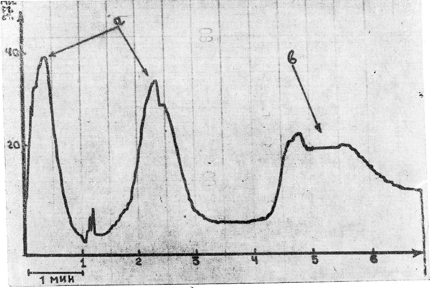У 4 рожениц с последовым периодом, осложнившимся интимным прикреплением плаценты (placenta adhaerens), что потребовало ручного отделения ее, радиотелеметрически зарегистрированы очень сильные схватки величиной в 114—120 мм рт. ст. и продолжительностью 2—3 мин. Подобное состояние ни разу не встречалось при регистрации нормального последового периода (рис. 3).