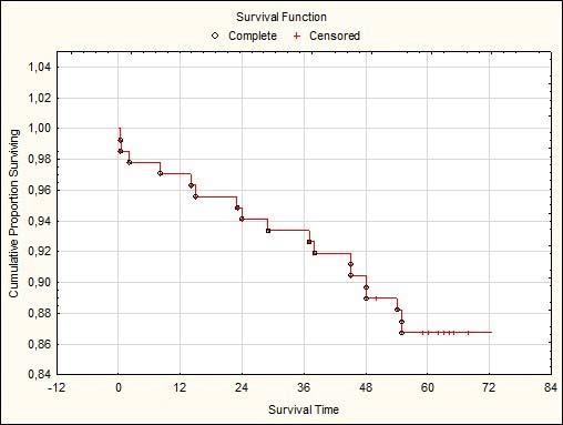 Материал и методы исследования. Включены 135 пациентов с острым коронарным синдромом, вошедших в «Регистр чрескожных коронарных вмешательств» в 2012–2013 гг. на базе Тюменского кардиологического центра — филиала Томского научно-исследовательского института кардиологии Российской академии наук. Через 12 и 60 мес оценивали клинический статус пациентов и проводимую медикаментозную терапию, проводили обследование, включающее эхокардиографию ультразвуковым сканером, суточное мониторирование электрокардиограммы и артериального давления по стандартной методике. Лабораторные исследования включали общий и биохимический анализы крови. Для определения факторов, ассоциирующихся с неблагоприятным прогнозом, использовали регрессионную модель пропорциональных рисков Кокса с пошаговым включением. Выживаемость оценивали по методу Каплана–Майера с использованием логрангового критерия (Log-rank test).