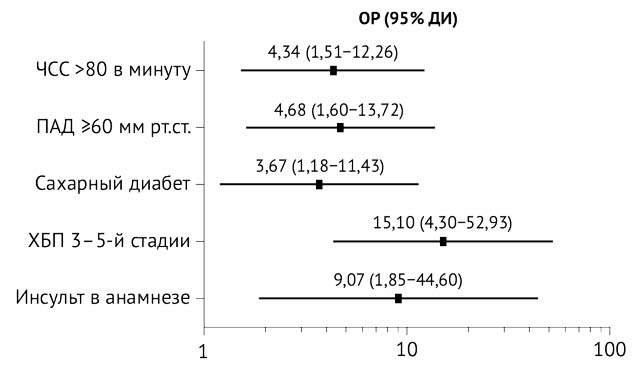 Согласно регрессионному анализу Кокса в исследуемой группе риск смерти возрастал при увеличении ЧСС >80 в минуту и ПАД >60 мм рт.ст. Относительный риск неблагоприятного прогноза был выше у пациентов с сахарным диабетом, ХБП 3–5-й стадии и при наличии инсульта в анамнезе (рис. 2).