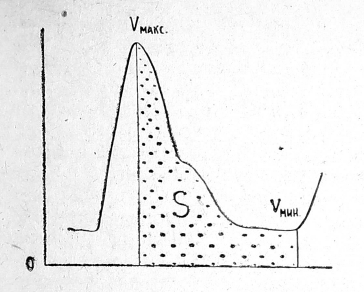 Рис.1. Пульсовая волна скорости кровотока. Vmax - максимальная линейная скорость кровотока в см/с, Vmin - минимальная линейная скорость кровотока в см/с, S - площадь диастолической части волны.