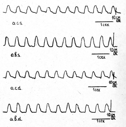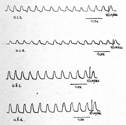 Рис. 3. Запись линейной скорости кровотока в сонных (а. с.) и плечевых (а. Ь.) артериях у новорожденного Н. на 9-и сутки жизни.