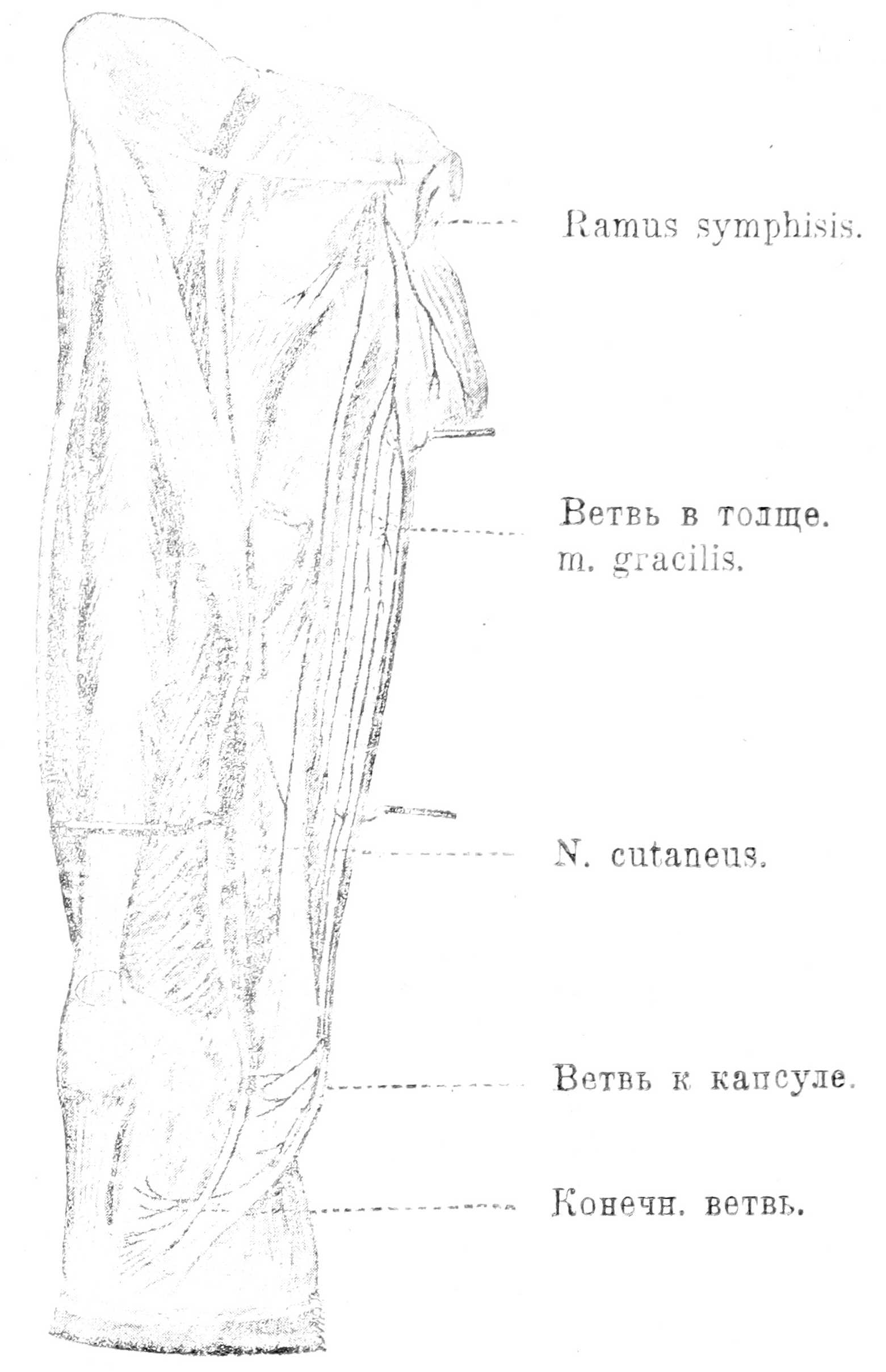 Задний стволик данной веточки в 8 наших случаях доходил до сухожилия m. gracilis, а в остальных несколько не достигал его. В отношении следующих 3—4 веточек можно только сказать, что они тоже идут в толще мышцы, убывая в своей длине, так что самая задняя веточка кончается приблизительно на уровне средины m. gracilis. Кроме того, в большинстве случаев наблюдается восходящая веточка по направлению к symphisis ossis pubis.