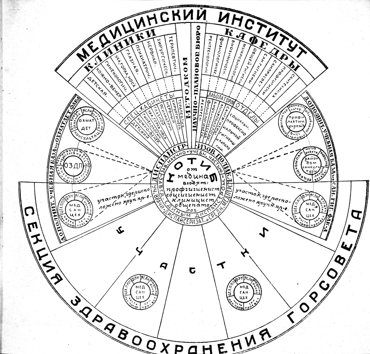 Ниже (см. чертеж на отд. листе) нами приведена схема организации учебного опытно показательного единого диспансера при Мединституте. Дабы быть конкретней, мы в дальнейшем при разборе этой схемы будем исходить из содержания работы его отделений, при ориентировке на них соответствующих академических единиц. Наиболее легко и просто устанавливается связь между диспансеризованной поликлиникой и мединститутом; мыслится она нам в направлении превращения специальных кабинетов диспансеризованной поликлиники в отделения соответствующих клиник и кафедр2).
