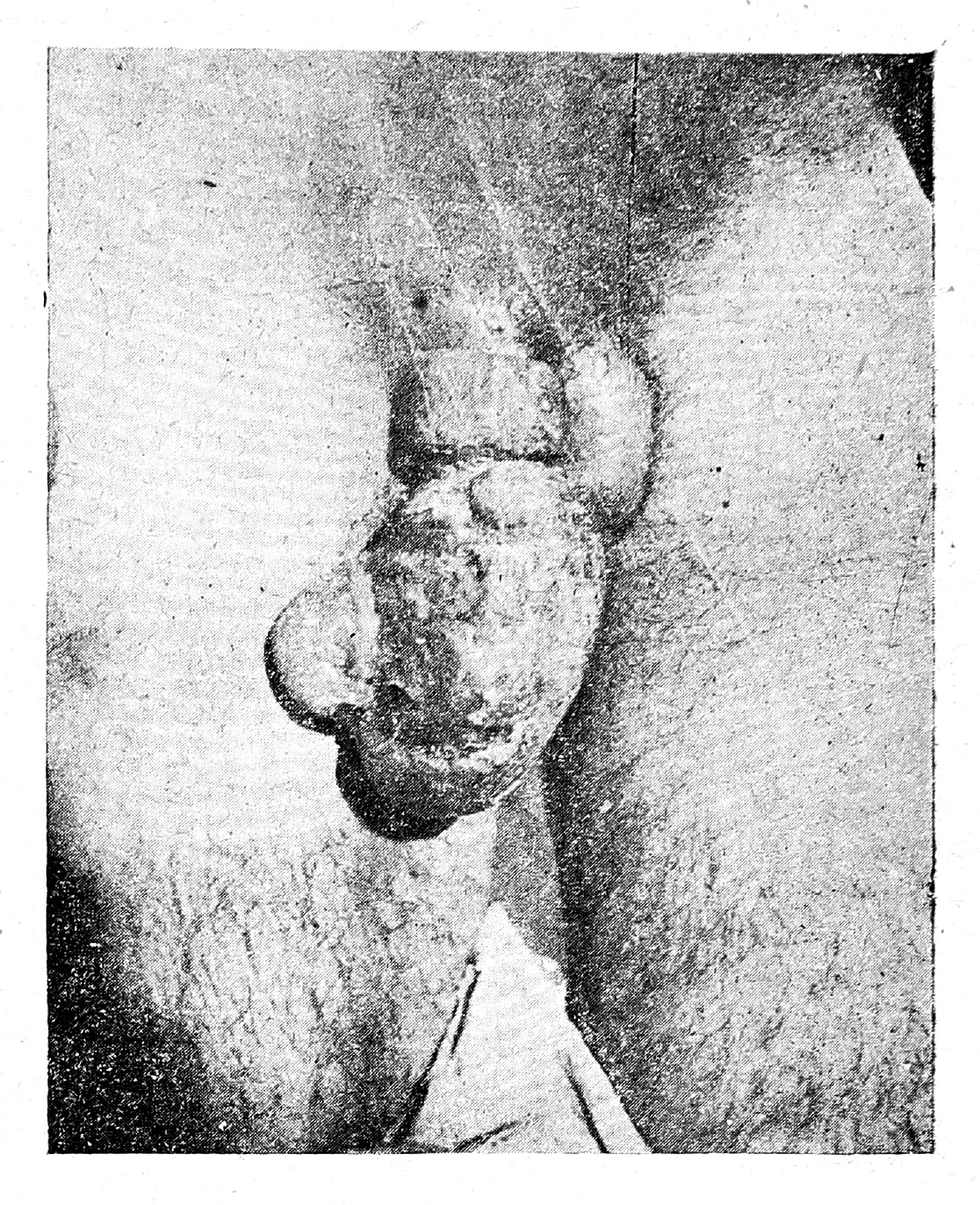 При осмотре penis оказался сильно деформированным, плотной мозолистой консистенции, покрытым продолговатыми, неглубокими, гноящимися, дурно пахнущими язвами. Обыкновенная рельсовая гайка, ржавая, охватывает корень члена, (см. рис.).