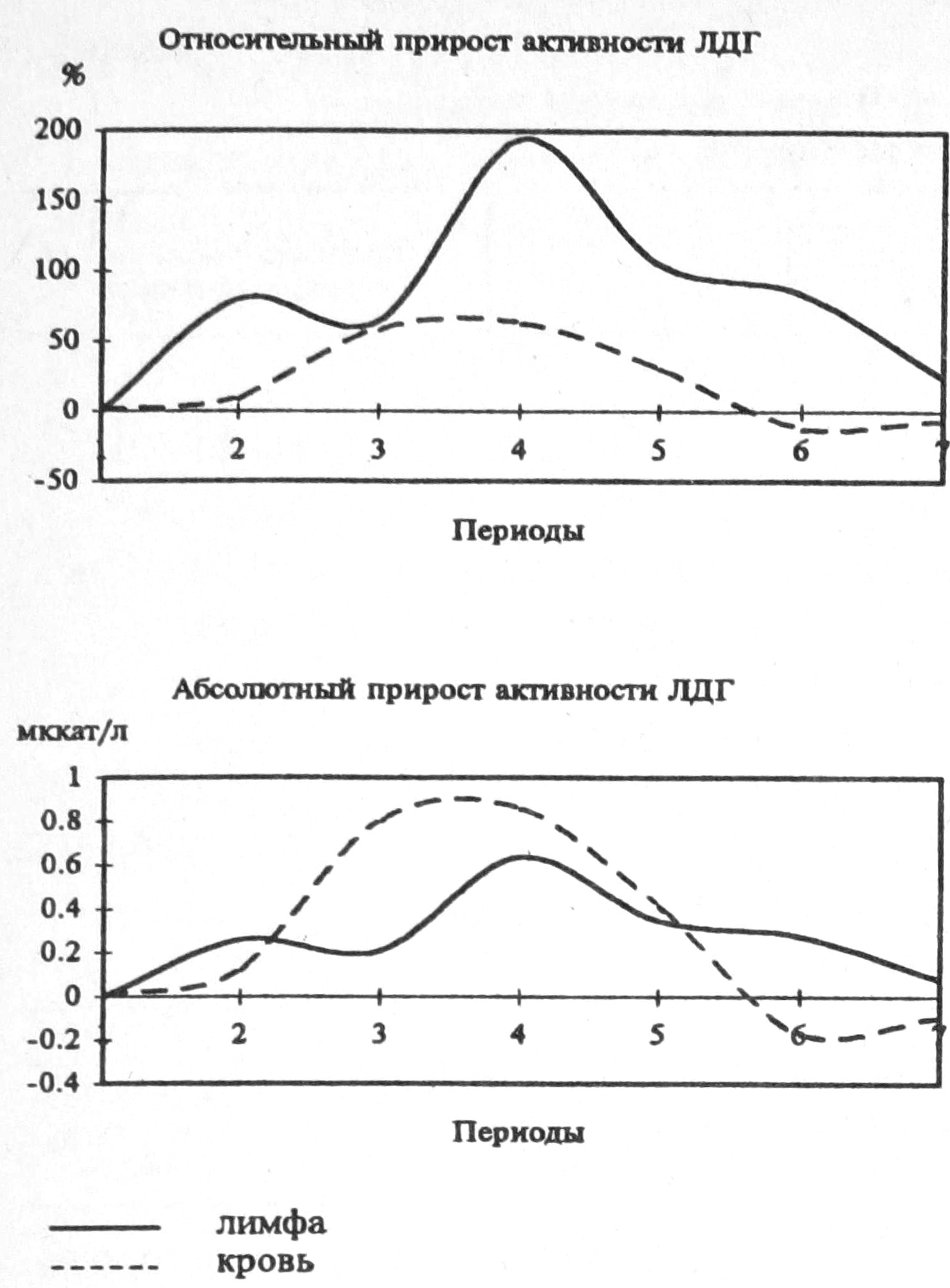 В состоянии покоя в крови собак, как и у человека, преобладает “сердечный” спектр изоферментов ЛДГ (быстро мигрирующие изоферменты ЛДГ-1 и ЛДГ-2). В лимфе ГЛП имеет место сдвиг в сторону “ мышечного” спектра (ЛДГ-4 и ЛДГ-5 ). Анализ соотношений Н/М субъединиц в лимфе и крови при мышечной работе показал, что при физической нагрузке наблюдается сдвиг изо ферментов ЛДГ в лимфе ГЛП в сторону “мышечного” спектра.