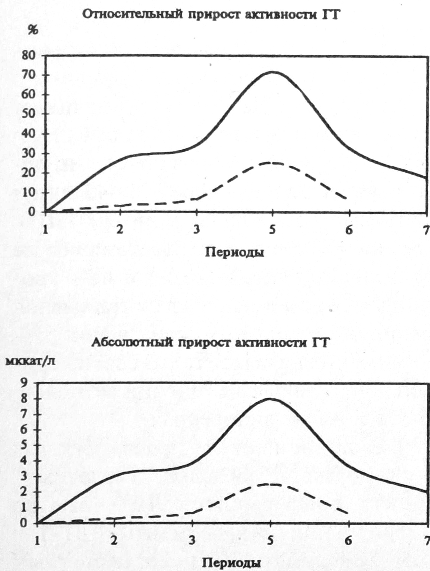 Общую активность ЛДГ определяли в сыворотке крови методом Sevela, Тоvarek [ 7], ее изоферментов — по И.И. Ивановой и др. [ 4], активность ГТ и АТ — с помощью набора Био-Ла- Тест фирмы "Лахема". Статистический анализ полученного экспериментального материала проводили используя прикладной пакет статистических исследований МКС+ к персональному компьютеру.
