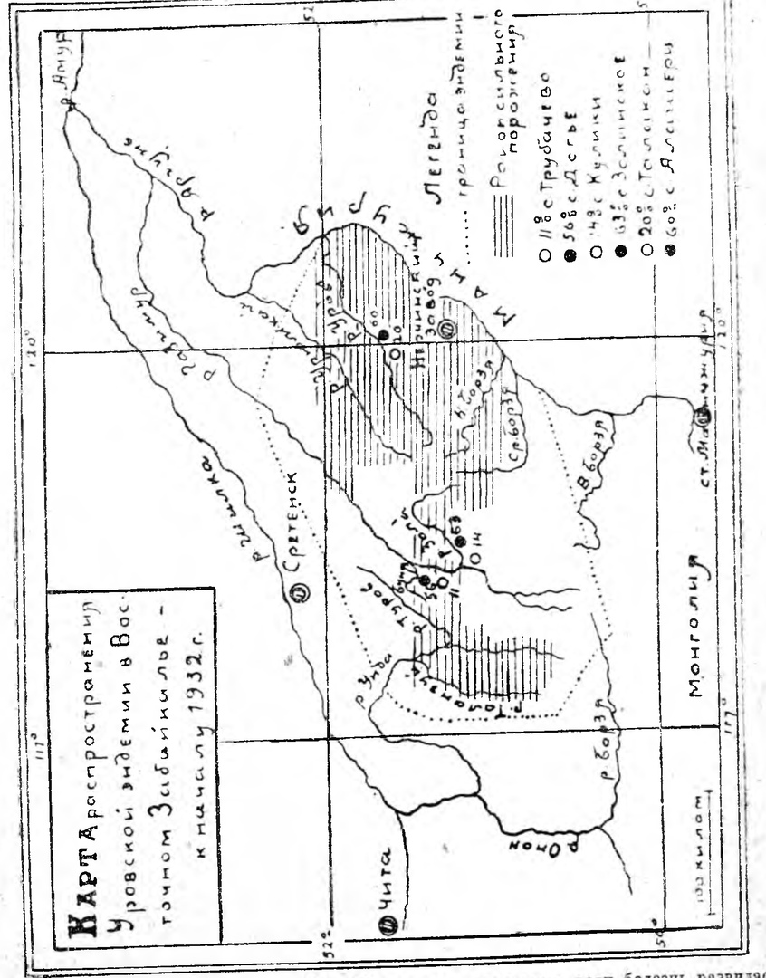 Есть основания думать о расширении области эндемии: появление заболевания в новых местах. Наряду с этим необходимо особо отметить, что при всех прочих будто бы равных условиях два соседних селения могут иметь весьма различную пораженность, например: Талакан 20%, в 6 км. по течению р. Урова с. Алашири—60% с большим количеством случаев III степени, что не вяжется с концепцией авитаминоза или овощного голодания, или: с. Догье на р. Буне 56%, Трубачево, в 8 км., но на другой реке Газимуре,—11%, что подчеркивает значение водного фактора. Все четыре перечисленных селения пользуются водой исключительно из упомянутых рек (нет ни ключей, ни колодцев).