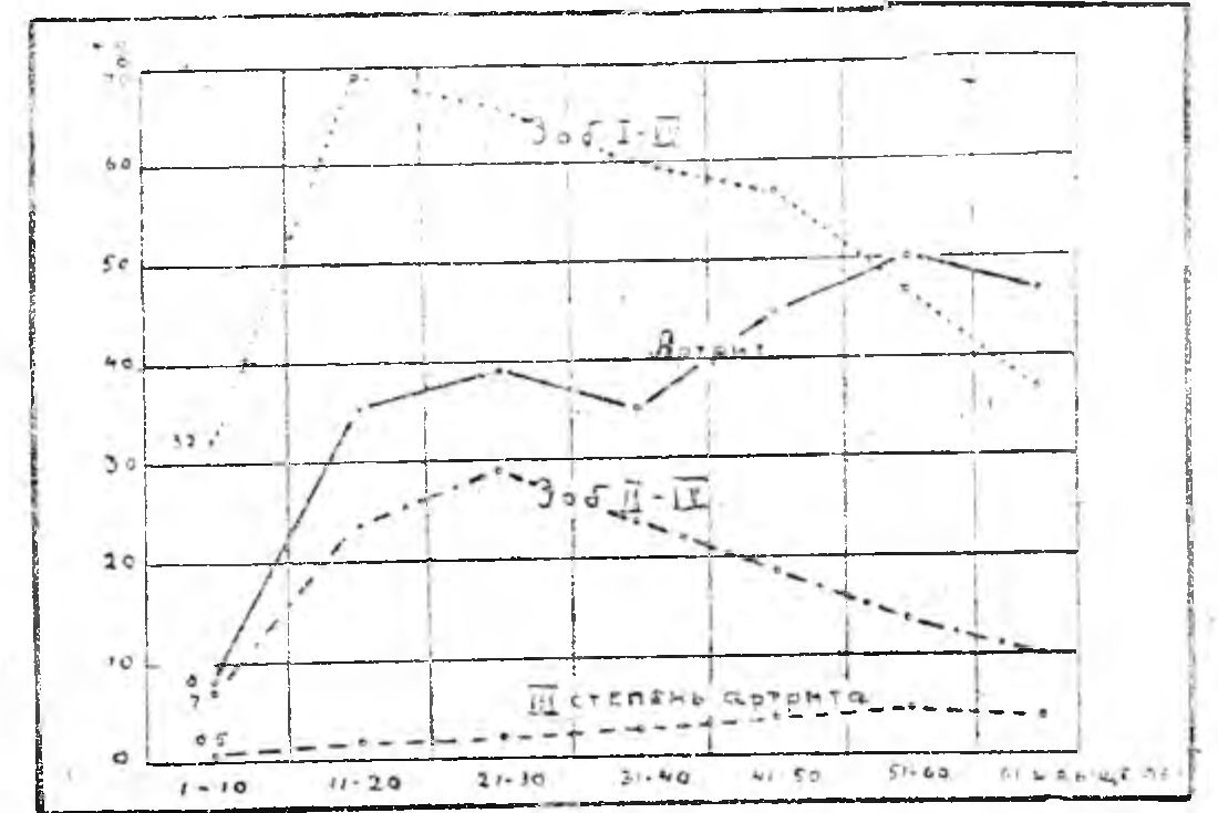 На интегральных кривых интенсивности поражения, представленных в диаграмме, выведенной из того же материала 33.238 случаев вышеперечисленные соотношения выступают наглядно и кроме того следует отметить, что: 1) поражение суставов прогрессирует с возрастом, т. е. с каждым годом присоединяются новые заболевания; падения кривой могут зависеть или от цикличности эндемии или от привходящих обстоятельств, 2) щ. ж, увеличивается у большого числа подростков, в пожилом же возрасте встречается у меньшего числа людей; снижение процента зоба с возрастом образует на диаграмме характерные .ножницы“, которые повторяются и на диаграммах по отдельным селениям. 3) Зоб II—IV повторяет движение зоба“ вообще, но дает наивысший % частоты- в возрасте 21—30 лет, за счет женщин, соответственно расцвету функции воспроизведения. 4) Пораженность III степени Бека дает нормальную суммированную кривую.